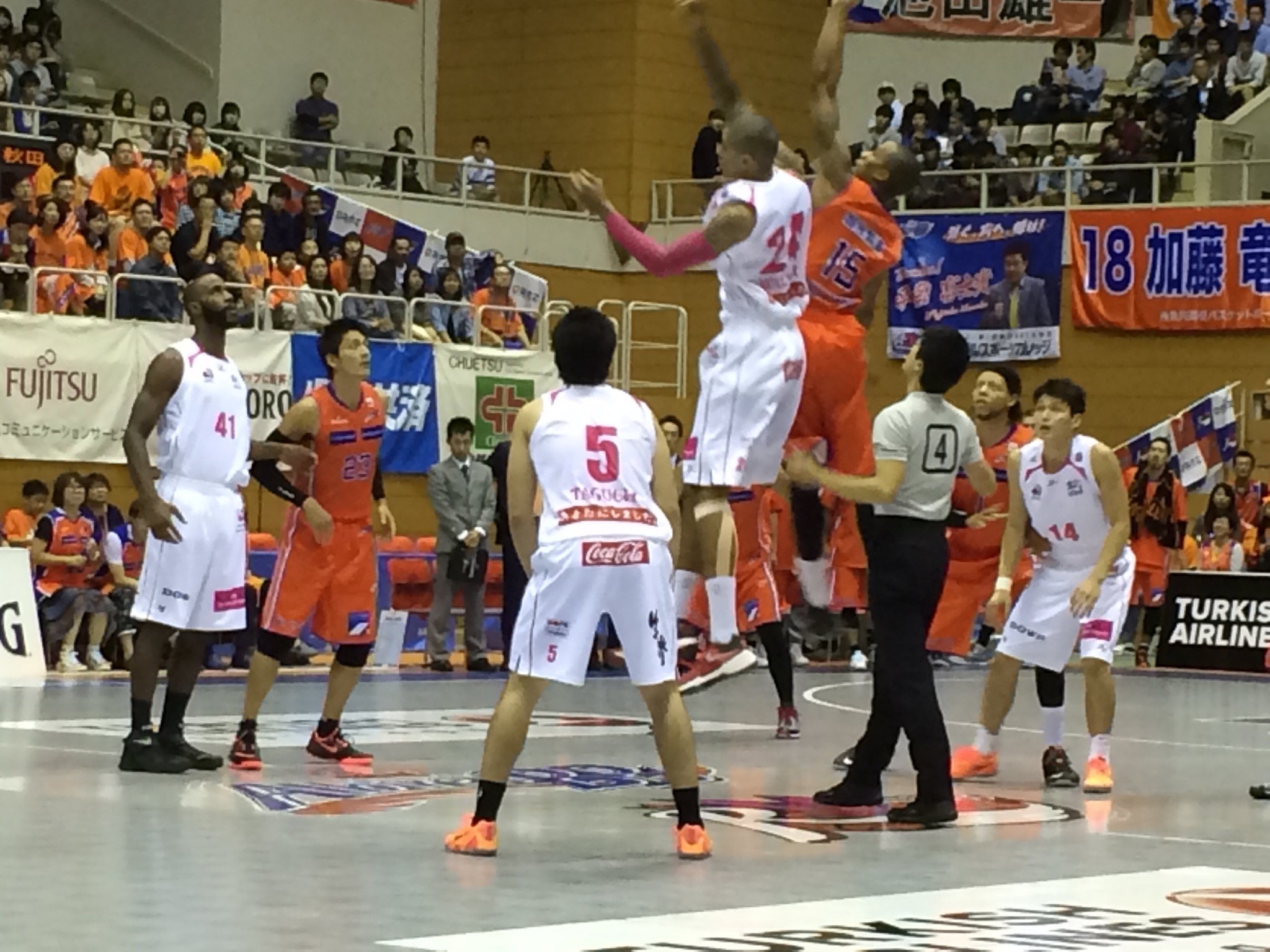 第二クオーターお互いにゾーンディフェンスに変えたりと工夫するも決定的にはならず、終盤秋田のスリーが入り出し追いつかれる